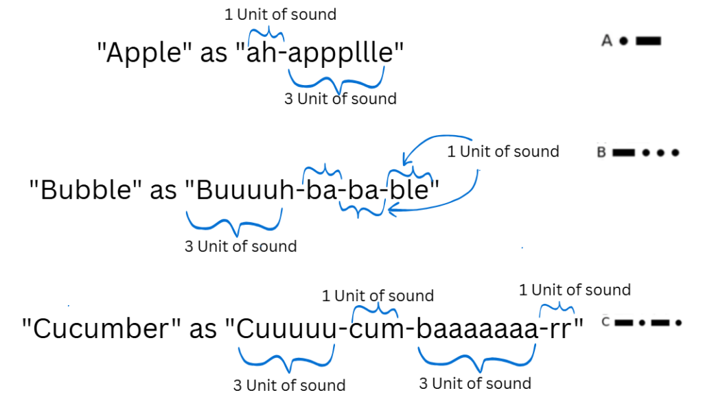 A= dih(1 unit) & dah(3 units) hence say “Apple” as “ah-apppllle”