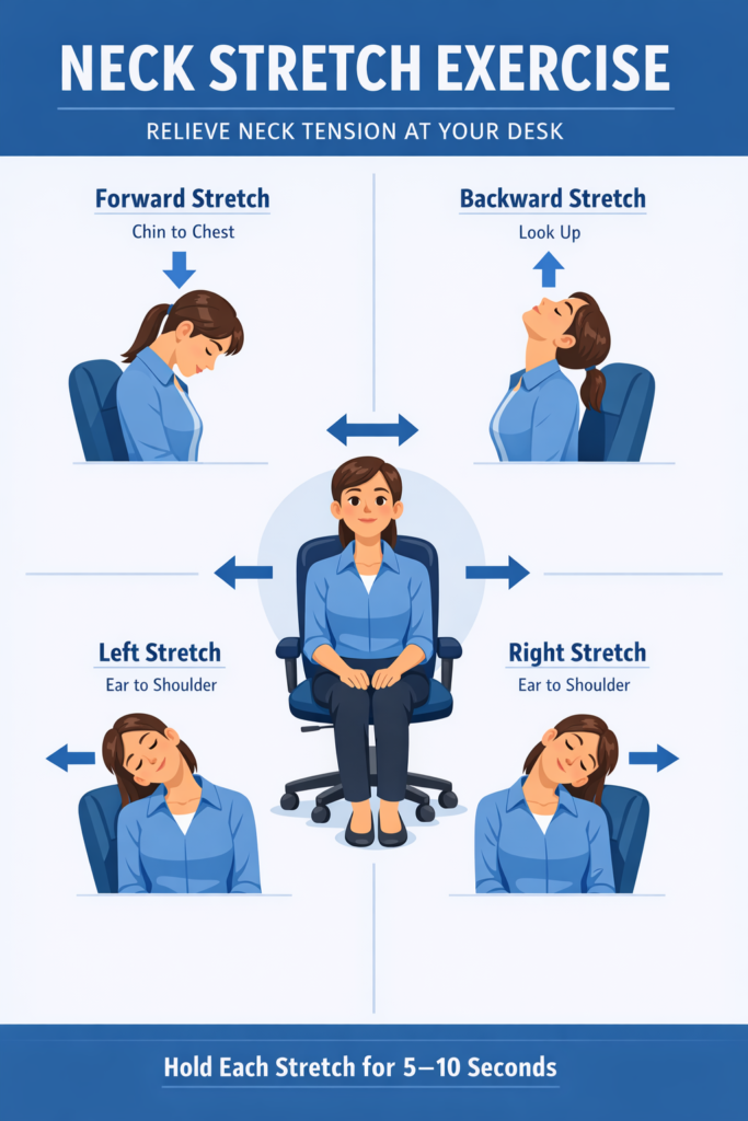 Gently tilt your head forward, backward, and side to side. Hold each position for 5–10 seconds.
