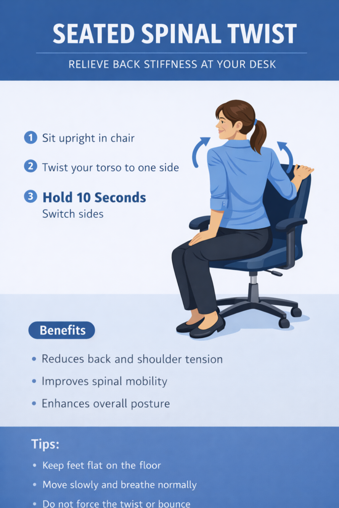 Sit upright, place one hand on the back of your chair, and gently twist your torso. Hold for 10 seconds and switch sides.