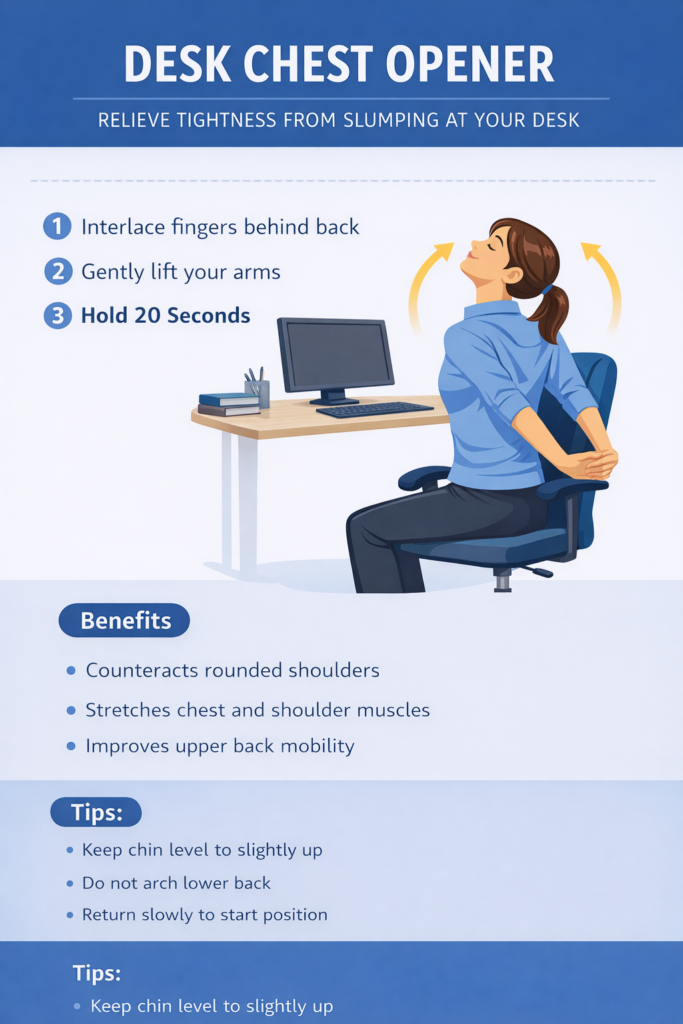 Benefits: Counteracts rounded shoulders caused by prolonged sitting.