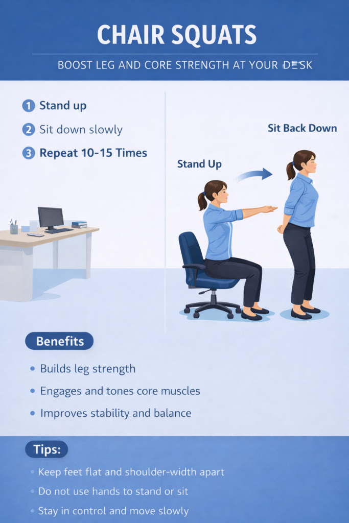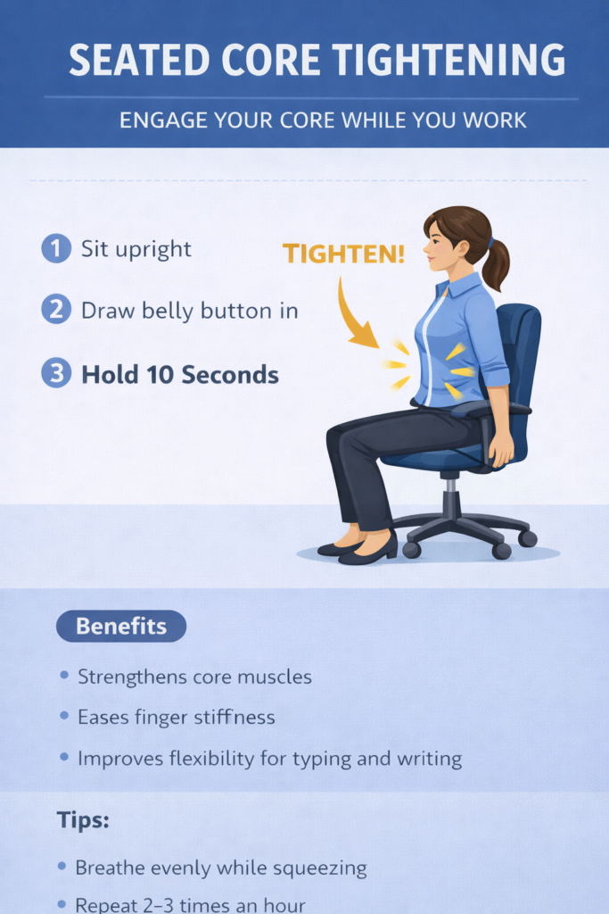 The good news? You don’t need a gym, workout clothes, or even much space to stay active. These simple office-friendly exercises can be done discreetly while working and help keep your body energized throughout the day.