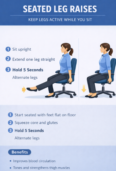 While seated, extend one leg straight and hold for 5 seconds. Alternate legs.
