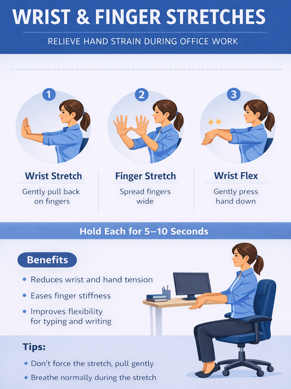 Stretch your fingers wide, rotate your wrists, and gently pull back each hand.